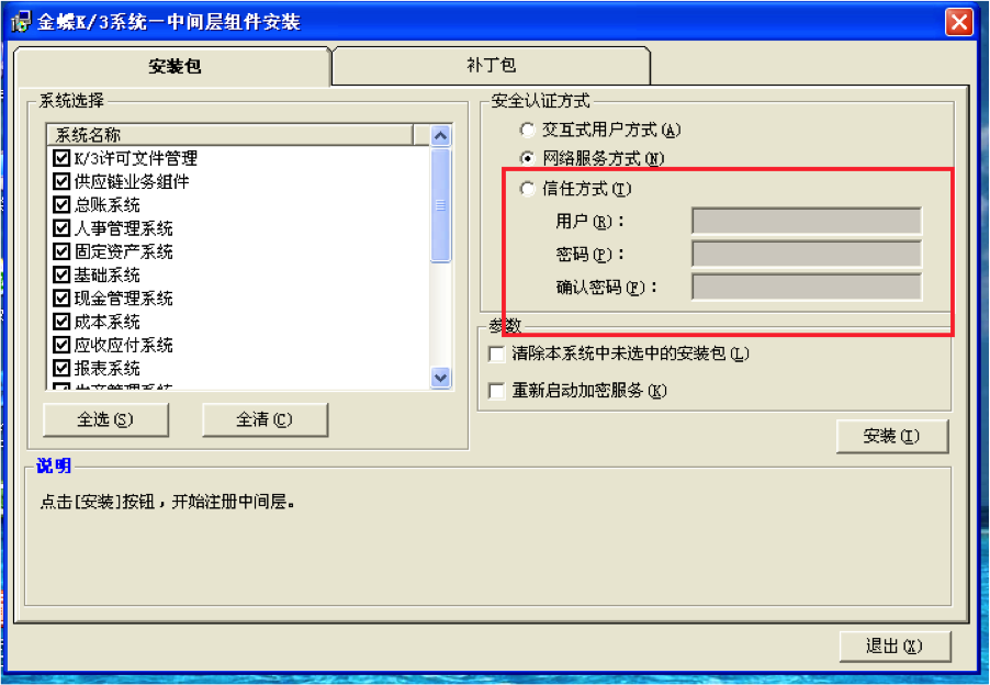 金蝶軟件報(bào)表打不開(kāi)是因?yàn)檐浖虚g層沒(méi)有采用“信任方式”進(jìn)行注冊(cè)。