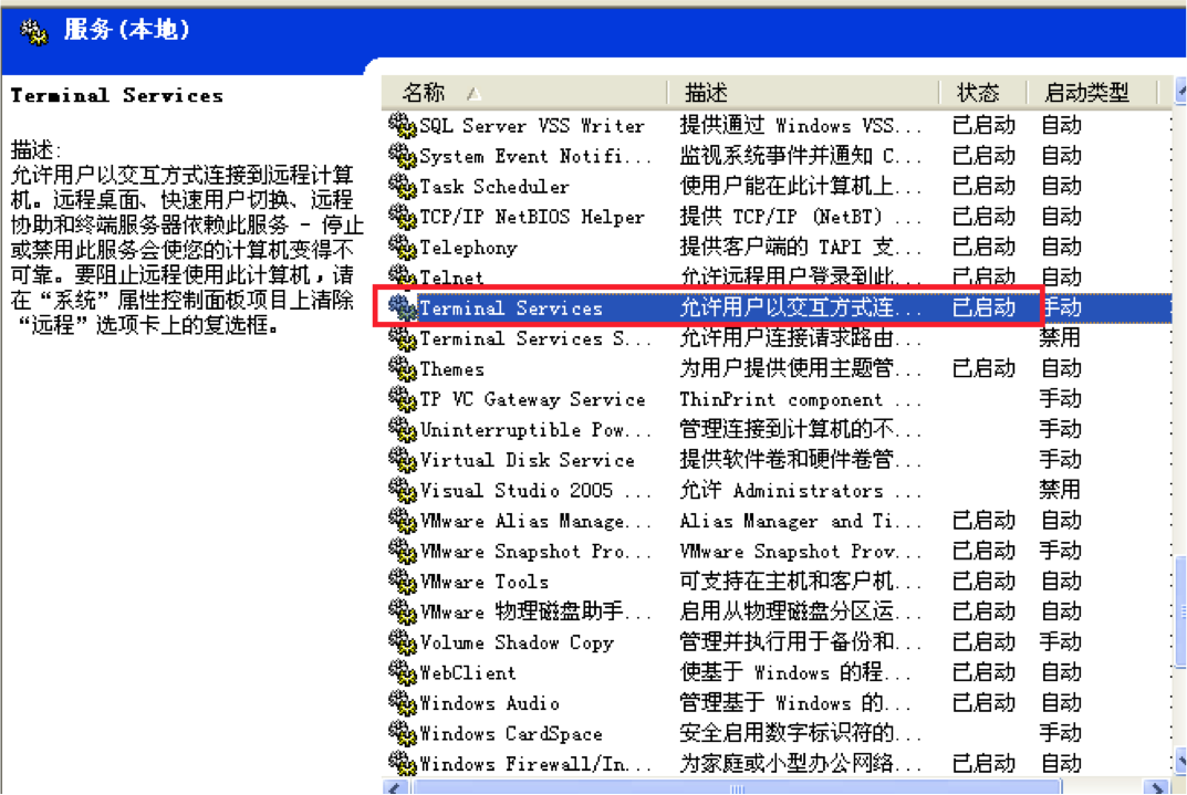 瑞友天翼5872的服務(wù)問(wèn)題是因?yàn)椴僮飨到y(tǒng)中終端服務(wù)terminal services禁用了,把這個(gè)服務(wù)啟用就可以解決這個(gè)問(wèn)題了。