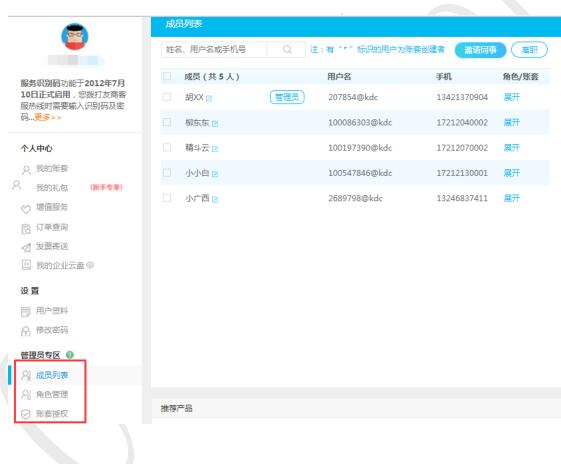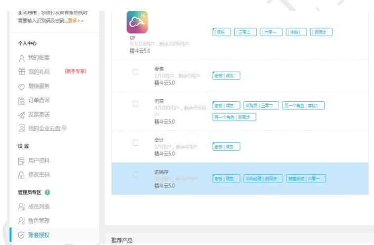 4、 賬套授權(quán)里,可選擇對(duì)應(yīng)的產(chǎn)品進(jìn)行授權(quán),針對(duì)成員設(shè)置對(duì)應(yīng)的角色信息