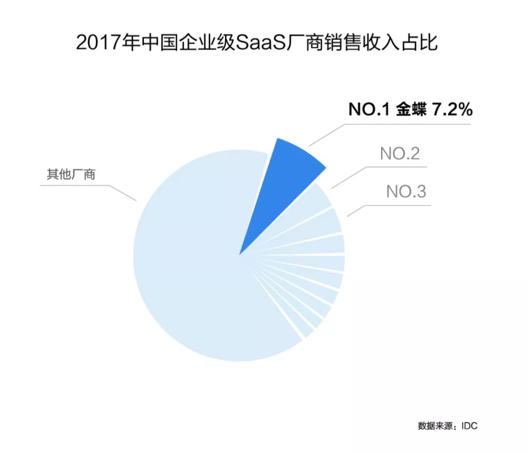 7月19日,IDC(國際數(shù)據(jù)公司)發(fā)布最新《中國公有云市場2017年下半年跟蹤報告》報告顯示,2017年中國公有云市場整體規(guī)模(IaaS & PaaS & SaaS)達到40億美元,SaaS 市場增速更是高達40.1%。其中,金蝶在2017年中國企業(yè)級SaaS廠商銷售收入占比7.2%,超越國內(nèi)外廠商位列第一。