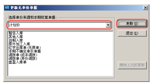 4. 無(wú)單價(jià)單據(jù)維護(hù):對(duì)于無(wú)單價(jià)入庫(kù)單,系統(tǒng)提供了一個(gè)簡(jiǎn)易快速方法批量維護(hù)其單價(jià),單擊【存貨核算】→【無(wú)單價(jià)單據(jù)維護(hù)】→【更新無(wú)單價(jià)單據(jù)】,在這里我們可以選擇以計(jì)劃價(jià)、最新入庫(kù)價(jià)、最新出庫(kù)價(jià)、期初加權(quán)平均價(jià)等價(jià)格對(duì)無(wú)單價(jià)單據(jù)進(jìn)行更新,具體采用哪一種價(jià)格標(biāo)準(zhǔn),請(qǐng)根據(jù)所在公 司財(cái)務(wù)核算要求確定。